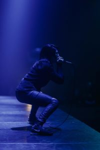In each video the vocal performance is inaudible, having been replaced by a 40hz bass tone, while between each loop the screen falls black and solo vocalisations emanate from a speaker situated between the projections.