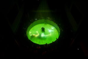 Sound in the installation plays an important role in portraying the performer’s struggle with the ability to resonate within or compete with Skjervsfossen waterfall, or the 8 second natural reverb in turbine hall of The Norweigen Museum of Hydro Power and Industry. In Magnesite Norway, we see again how Normoyle’s work tests the limits of the ‘experimental’ and ‘improvised’ music frameworks, by holding a camera to the bodies that create the music, outside the venue and bringing it back to the gallery as a visual arts practice.